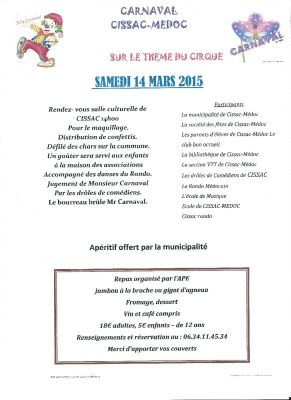 Puis un dîner vous est proposé par l'APE (18€/pers. - 5€ pour les moins de 12 ans) sur réservation par téléphone.