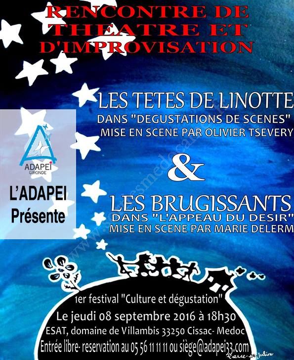 A l'issue du Jeudi de l'info sur "Les aventures extraordinaires..." l'ADAPEI vous propose une soirée toute aussi extraordinaire autour de la culture et du vin. Les Têtes de Linottes et les Brugissants proposeront leurs dernières créations théâtrales, alors que l'ESAT de Villambis vous fera déguster le dernier millésime de son Grand Cru Bourgeois.