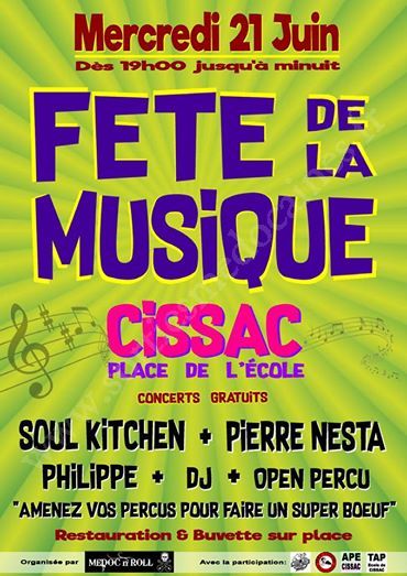 Moment incontournable sur toute la France : la Fête de la musique. Pour ce moment de festivité, la commune de Cissac met en avant cet événement dédié à la musique en proposant des concerts gratuits sur la place du village. Music’Action en Médoc collabore avec Medoc & Roll afin de proposer une programmation définitivement festive ! A l’affiche Soul Kitchen, Philippe et Pierre Nesta !