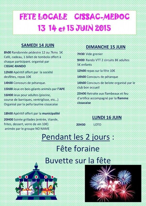 Catégorie : Brocantes et Vide-Greniers Feu d'Artifice Fêtes Foraines Loisirs enfants Belote Loto Apéritif Diner Concert A pied Pétanque VTT-Vélo