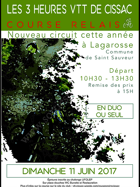 Mise à jour du 10/06/17 : Suite à l'annulation des 3 heures, le vtt cissac organise une rando vtt avec 2 circuits au choix 25 et 35 kms demain matin départ 9h du stade. Ravitaillement à l'arrivé ainsi qu'une tombola.