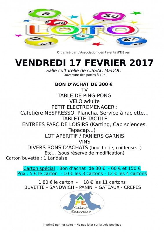 L'association des parents d'élèves de Saint-Sauveur organise son loto à la salle culturelle de Cissac Médoc suite aux travaux dans la salle polyvalente.