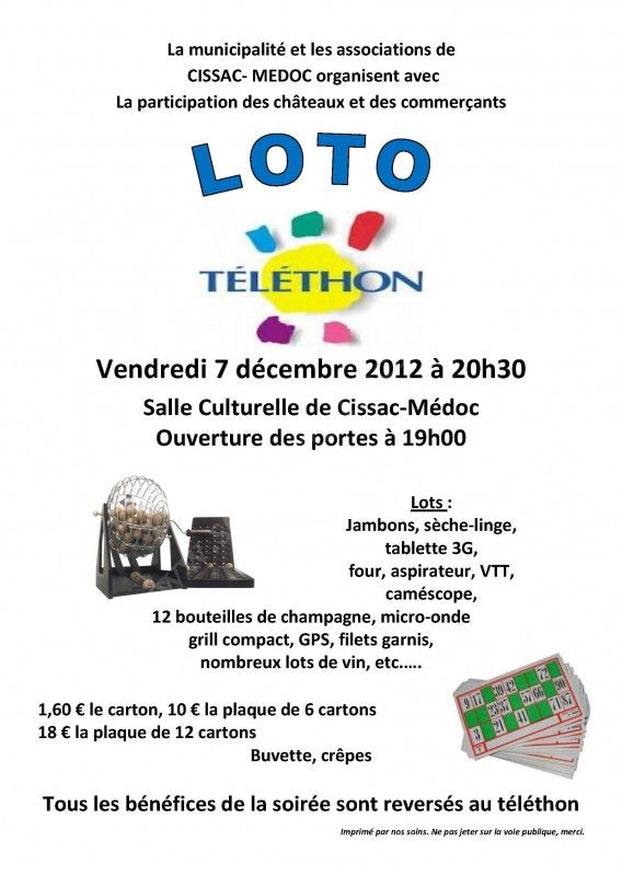 La municipalité et les associations de CISSAC-MEDOC organisent, avec La participation des châteaux et des commerçants, ce loto !