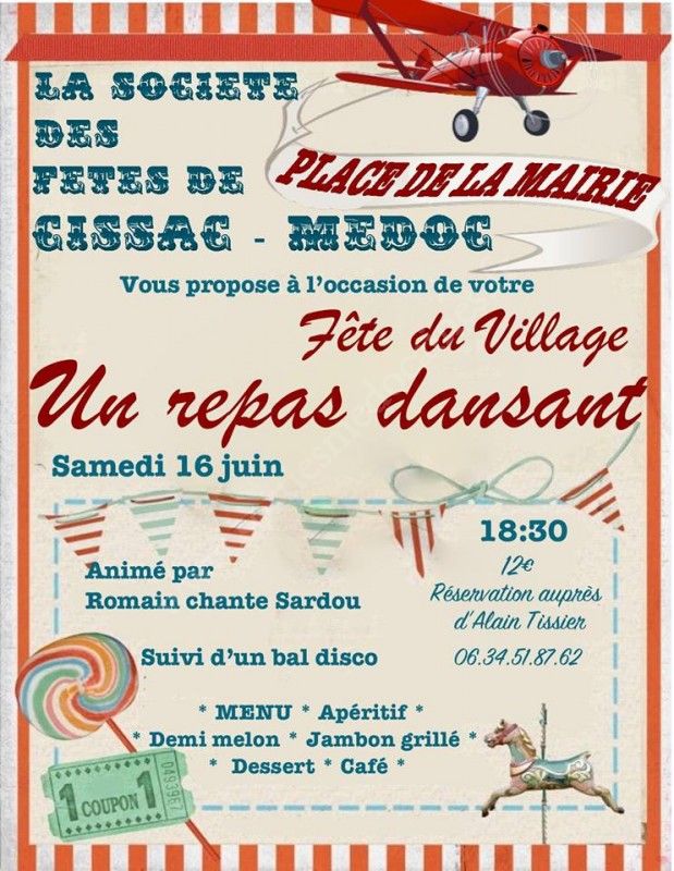 La Société des Fêtes de Cissac vous propose à l'occasion de la Fête du Village un Repas Dansant.