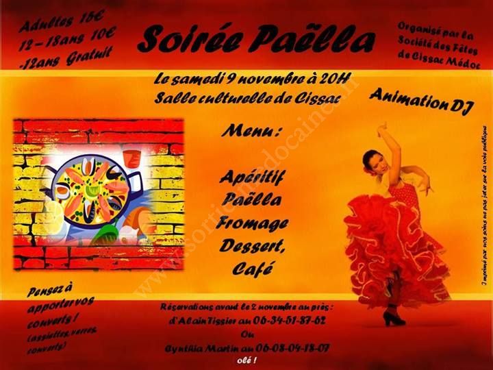 La Société des Fêtes de Cissac vous invite à une soirée paëlla animée par un DJ.
