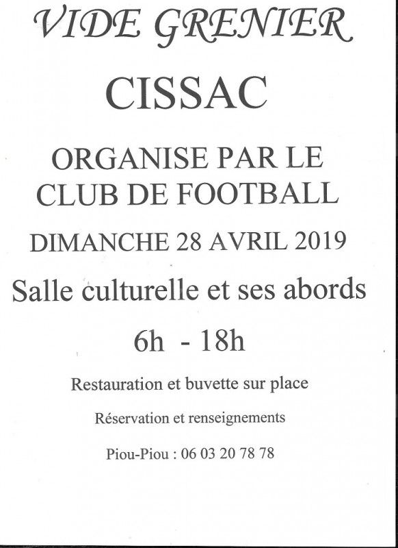 Le SA CISSAC section football organise un vide-grenier le diamnche 28 avril 2019 salle culturelle et abords place de la Mairie.