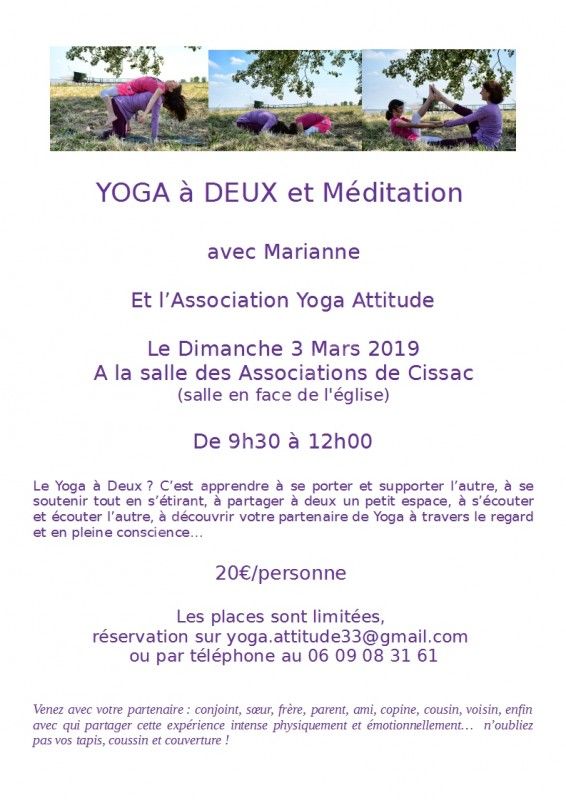 L'association Yoga Attitude vous propose un stage "Yoga à Deux et Méditation" animé par Marianne.