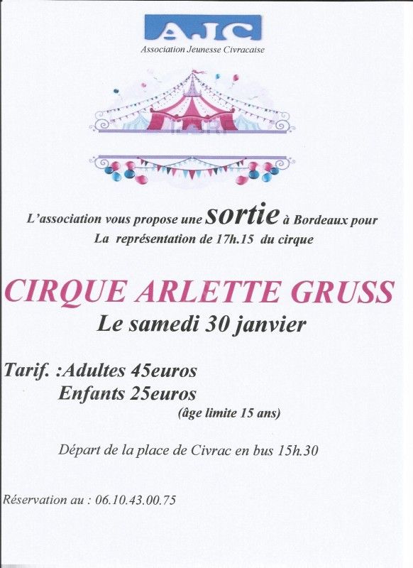L'association JEUNESSE CIVRACAISE vous propose une sortie au cirque ARLETTE GRUSS à Bordeaux.