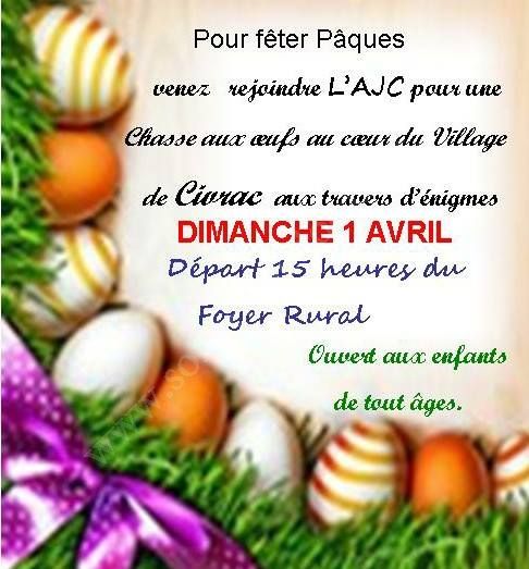 Pour fêter Pâques, venez rejoindre l'AJC pour une chasse aux oeufs au coeur du village de Civrac aux travers d'énigmes.