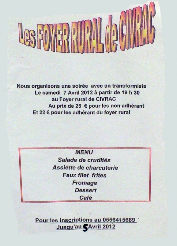 Le foyer rural de Civrac organise une soirée avec un transformiste.