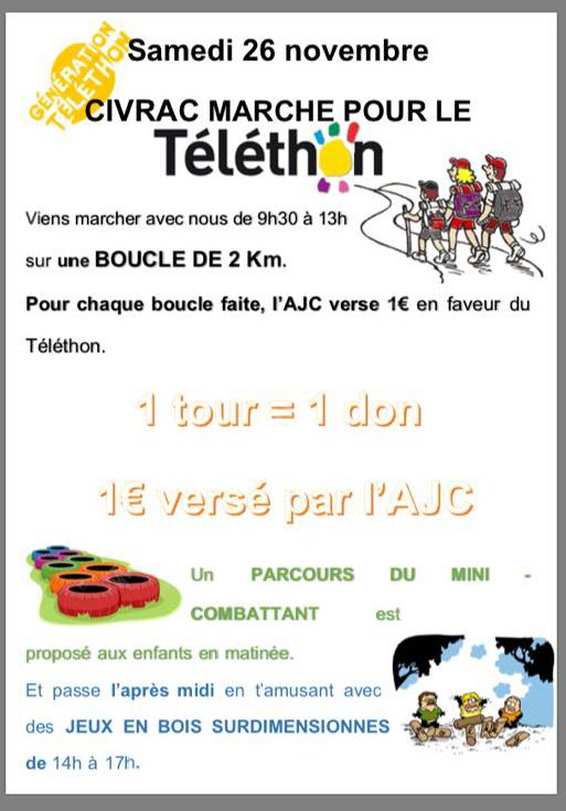 Tous au Téléthon Au Foyer Rural de Civrac Le Vendredi 25 novembre 2016 à partir de 19h30 au Samedi 26 Novembre 2016 17h00.