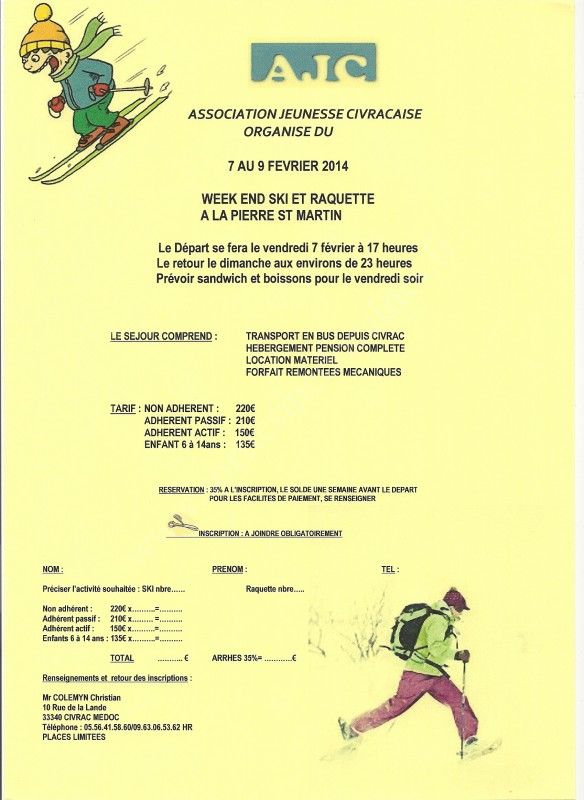 L'ASSOCIATION JEUNESSE CIVRACAISE ORGANISE UN WEEK END SKI ET RAQUETTE DU 7 AU 9 FEVRIER 2014