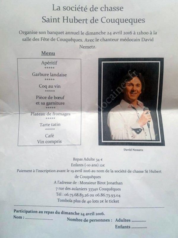 La Société de Chasse Saint-Hubert de Couquèques organise son banquet annuel le dimanche 24 avril 2016 avec le chanteur Médocain David Nemetz.