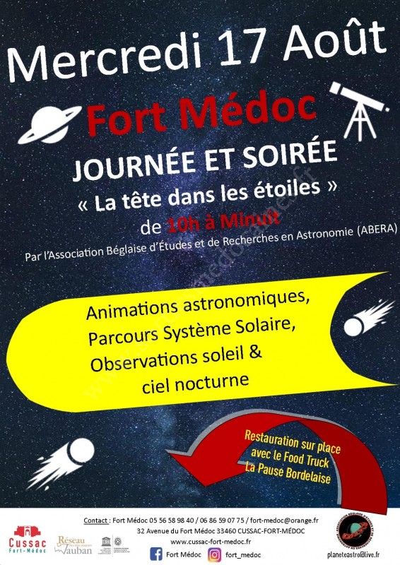 L'association A.B.E.RA. (Association Béglaise d'Études et de Recherches en Astronomie) vous propose une journée et soirée à observer le Soleil et les étoiles dans l'enceinte du Fort Médoc avec des instruments optiques adaptés pour une observation en toute sécurité.