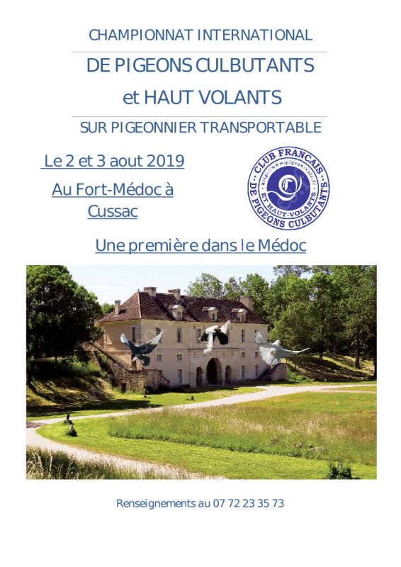 Le Club Français de Pigeons Culbutants et Haut-Volants fut fondé en 1975 organise cette année du 2 au 3 Août, son championnat International sur pigeonnier transportable dans l'enceinte du fort Médoc, situé sur la commune de Cussac Fort Médoc.
