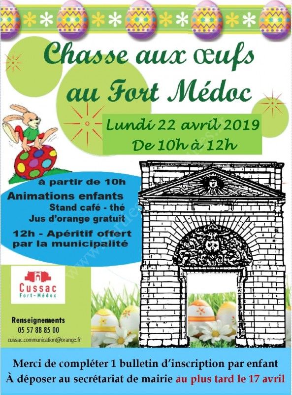 La traditionnelle chasse aux œufs de Pâques aura lieu cette année le LUNDI 22 AVRIL 2019 de 10h00 à 12h00 au FORT MÉDOC !