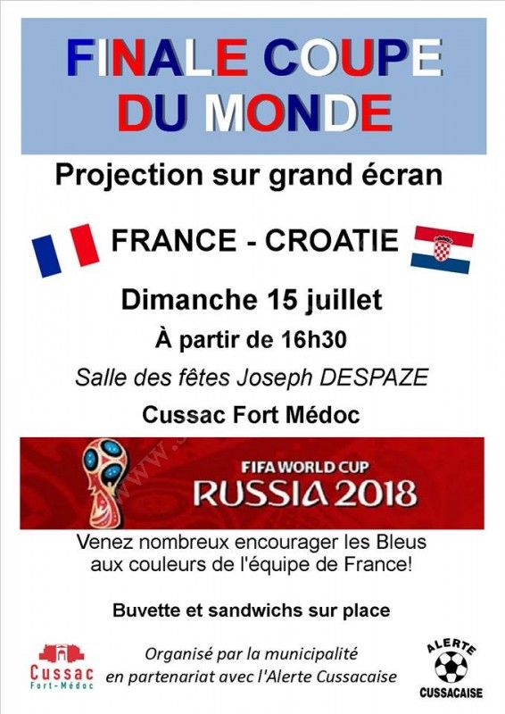 Dimanche après-midi diffusion de la finale de la coupe du monde France / Croatie sur grand écran à la salle des fêtes de Cussac Fort médoc !!