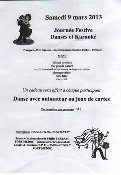 Sur inscription (par chèque à l'ordre du club de Loisirs et Tourisme - BP 11 - 33460 Cussac-Fort-Médoc)