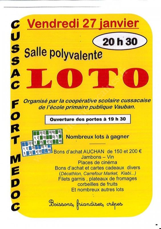 LOTO ce VENDREDI 27 JANVIER 2017, organisé par la Coopérative Scolaire Cussacaise de l'école Vauban.