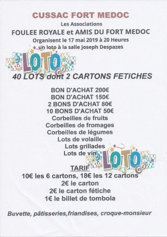 SUPER LOTO VENDREDI 17 MAI 2019 organisé par les associations Les Amis du Fort Médoc & La Foulée Royale.