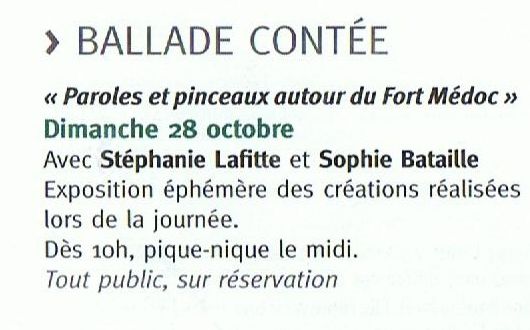 => 14 h 30 : Départ de la balade contée avec Stéphanie LAFFITTE dans l'enceinte du Fort Médoc. Sur Réservation au 05 56 58 91 30. (50 places)