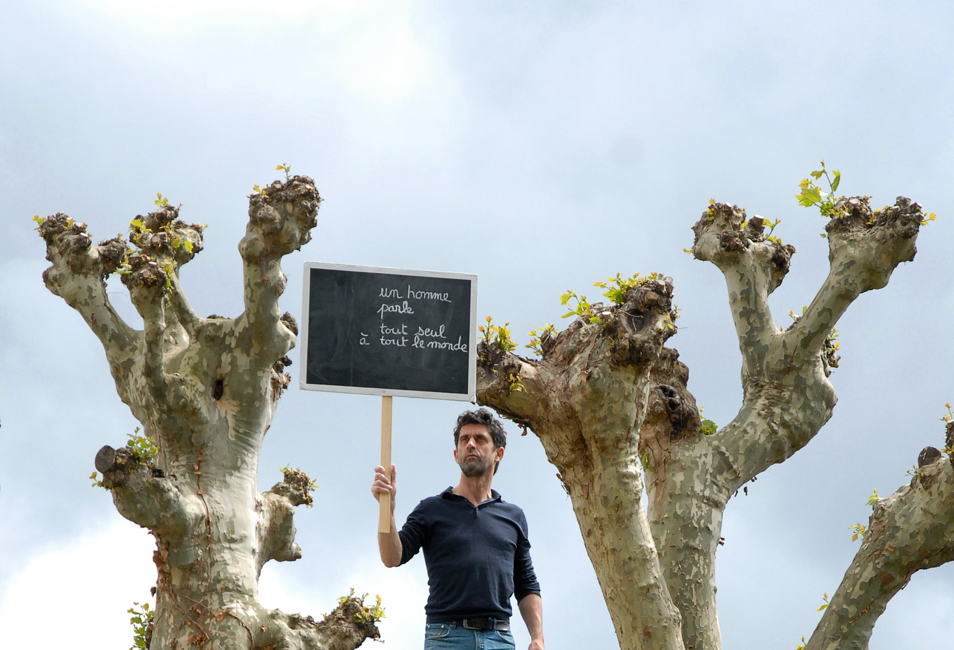 Dans un endroit entre dedans et dehors, un homme parle seul, à tout le monde. Il vérifie son existence auprès des autres, tout en craignant de les rencontrer ou de les affronter. Pourtant, le voilà qui s’expose sur une scène de théâtre. Il hésite, il doute, il témoigne par la dérision et l’humour de ce qu’il pense approximativement des choses.