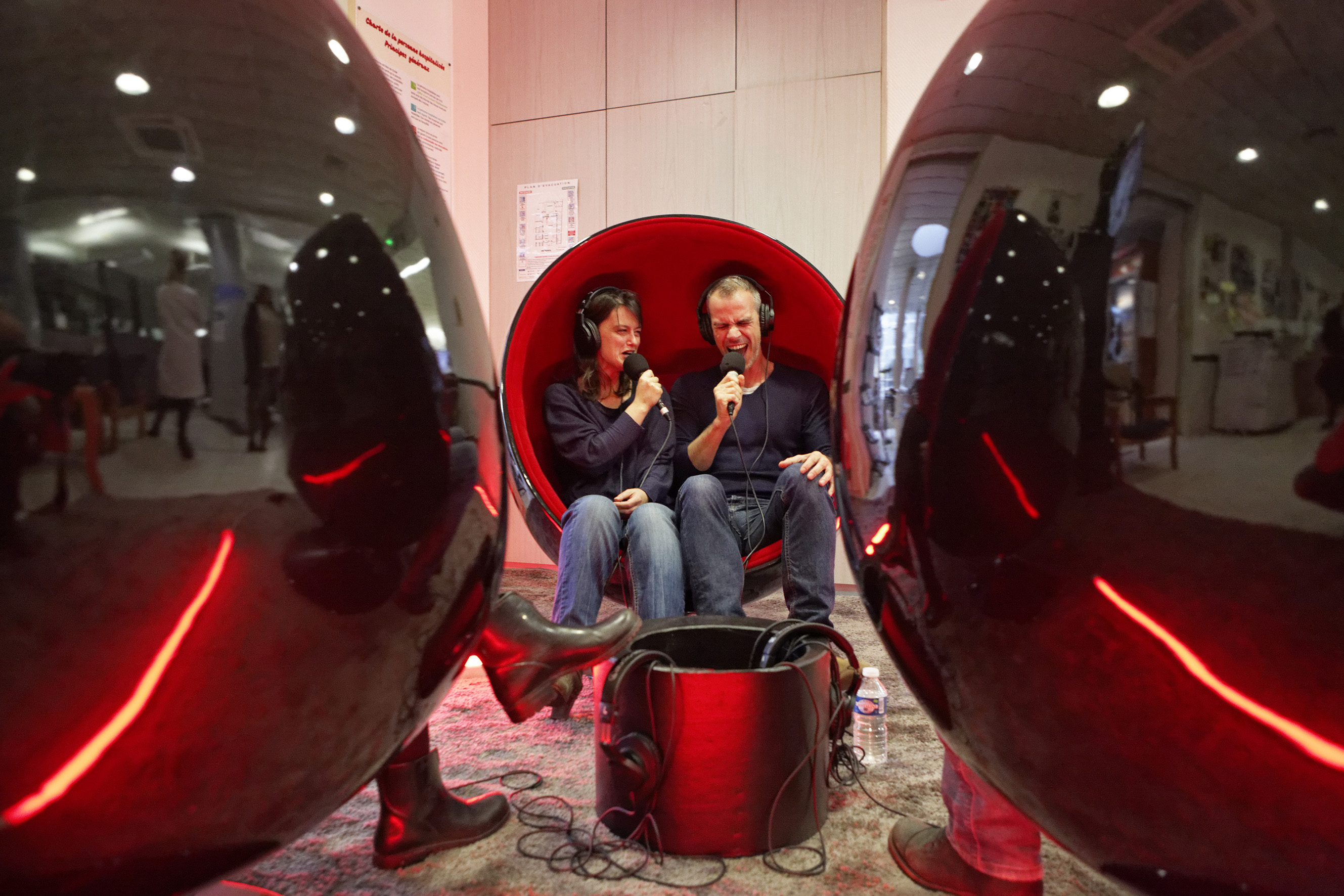 Installez-vous bien confortablement dans un fauteuil-bulle et emparez-vous d’un casque. Face à vous, des comédiens équipés d’un micro chuchotent une micro-nouvelle à vos oreilles. Son titre : «Derrière la porte».
