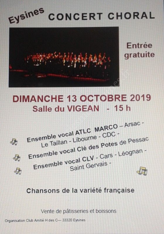 Le club de l'Amitié du bourg d'Eysines organise pour la 8ème année consécutive un grand CONCERT CHORAL