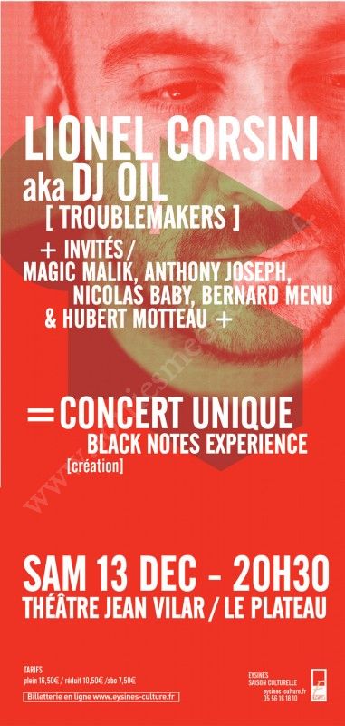 La Ville d'Eysines a confié une carte blanche à Lionel Corsini sur l’ensemble de la saison. Pour sa première, il choisit son nouveau projet en résidence de création autour du jazz, de l’électro jazz et du trip-hop : Black Notes Experience. Ce spectacle est le fruit de multiples histoires, de voyages, de rencontres opportunes et/ou insolites. Lionel Corsini est un artiste qui en invite d'autres pour improviser, créer un langage musical commun issu de leurs rencontres ; sur scène défileront donc des musiciens de divers horizons : Anthony Joseph, Nicolas Baby, Magic Malik, Bernard Menu, Hubert Motteau sans oublier Bruno Corsini à la création visuelle.