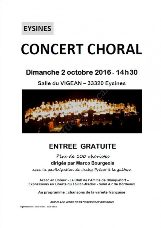 Les choristes d'Arsac en Choeur, du club de l'amitié de Blanquefort, d'Expressions en Liberté du Taillan-Médoc et de Solid'air de Bordeaux seront réunis en un seul et même choeur pour un après midi en chanson.