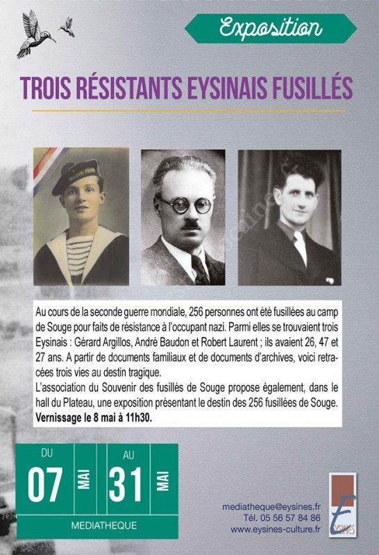 Au cours de la seconde guerre mondiale, 256 personnes ont été fusillées au camp de Souge pour faits de résistance à l’occupant nazi. Parmi elles se trouvaient trois Eysinais : Gérard Argillos, André Baudon et Robert Laurent ; ils avaient 26, 47 et 27 ans.
