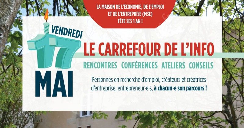 Vendredi 17 mai 2019, la M3E (Maison de l’économie, de l’emploi et de l’entreprise) d'Eysines convie les chef·fe·s d'entreprise et les demandeurs d’emploi à une journée de conférences, d’échanges et d’ateliers pour fêter ses 1 an.