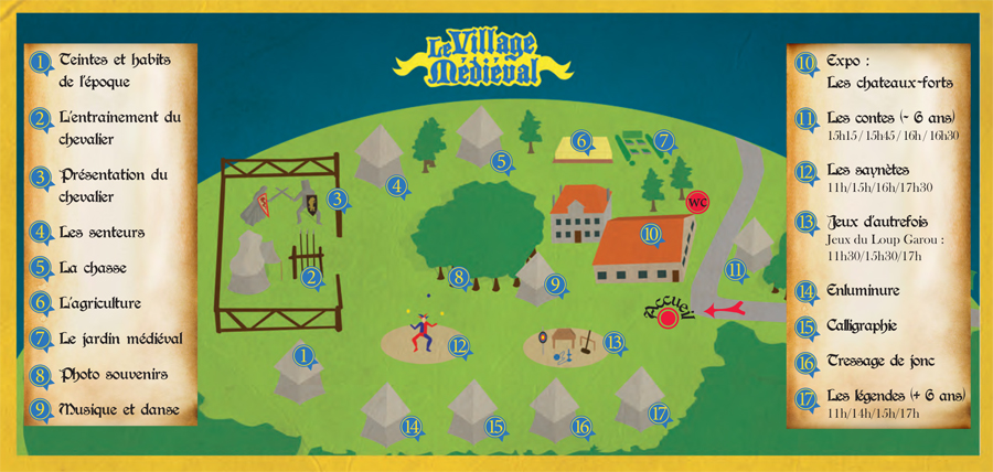 L'entraînement du chevalier, l'agriculture, la calligraphie, les habits de l'époque sont parmi les multiples ateliers et démonstrations tout comme la taille de la pierre, le tissage, le filage, ou la teinture du tissu auxquels le public pourra s'adonner dans les tentes déployées autour du Clos Lescombes. Une exposition sur les châteaux forts, des jeux d'autrefois, musiques et danses médiévales mais aussi des contes, des saynètes sont également proposés aux enfants. Les représentations sont à retrouver à différentes heures tout au long de la journée.