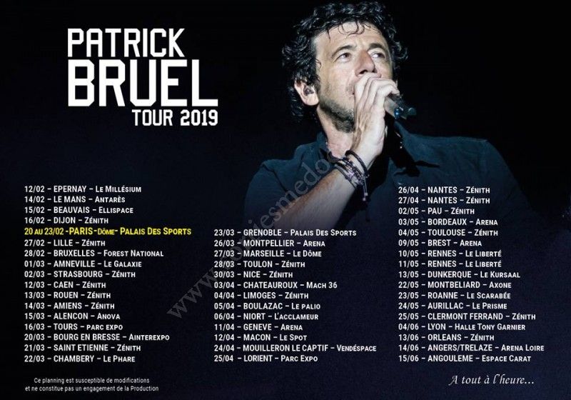 Des millions d’albums vendus, des tournées gigantesques et des concerts qui restent gravés dans les mémoires, retrouvez Patrick Bruel dans les plus grandes salles de France, Suisse, Belgique et Canada entre autres à partir de février 2019.