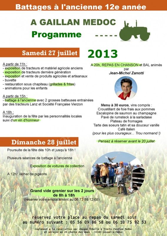 Réservation avant le 20 juillet par téléphone, paiement à la réservation par chèque libellé à Tracto Passion Médoc - 28 chemin des ânes - 33340 Lesparre-Médoc.