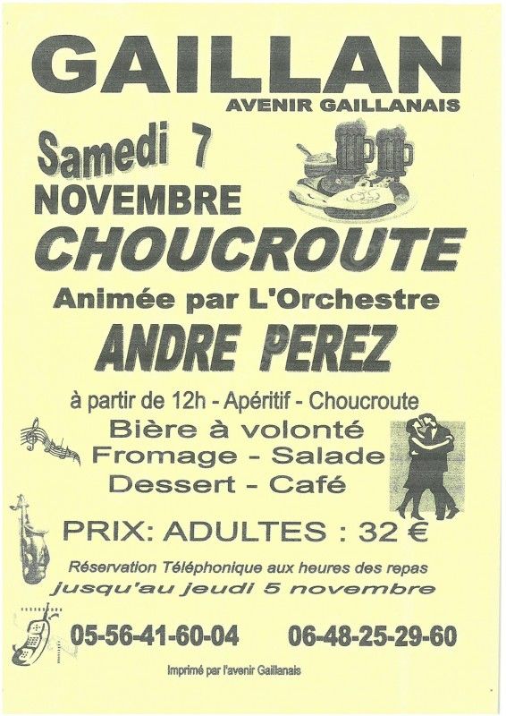 Choucroute organisée par l’Avenir Gaillanais et animée par l’Orchestre Andrée Perez.