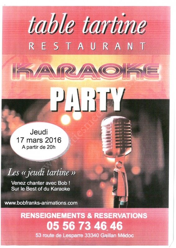 Karaoké party au restaurant Table Tartine à LESPARRE. A partir de 20h. Renseignements et réservations :
