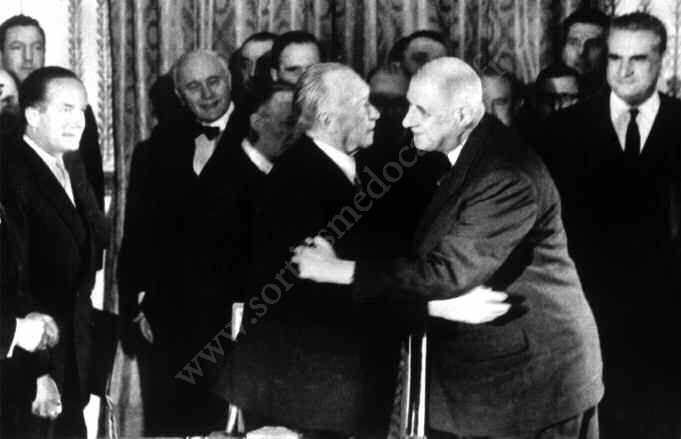 "Le traité de l'Élysée fut signé le 22 janvier 1963 par le chancelier Konrad Adenauer et le président Charles De Gaulle.