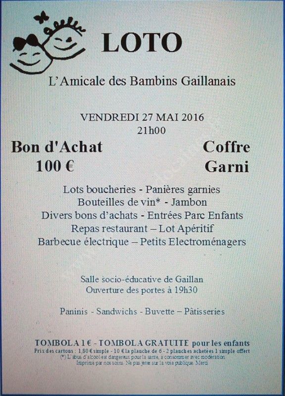 L'AMICALE DES BAMBINS ORGANISE SON LOTO LE VENDREDI 27 MAI 2016.