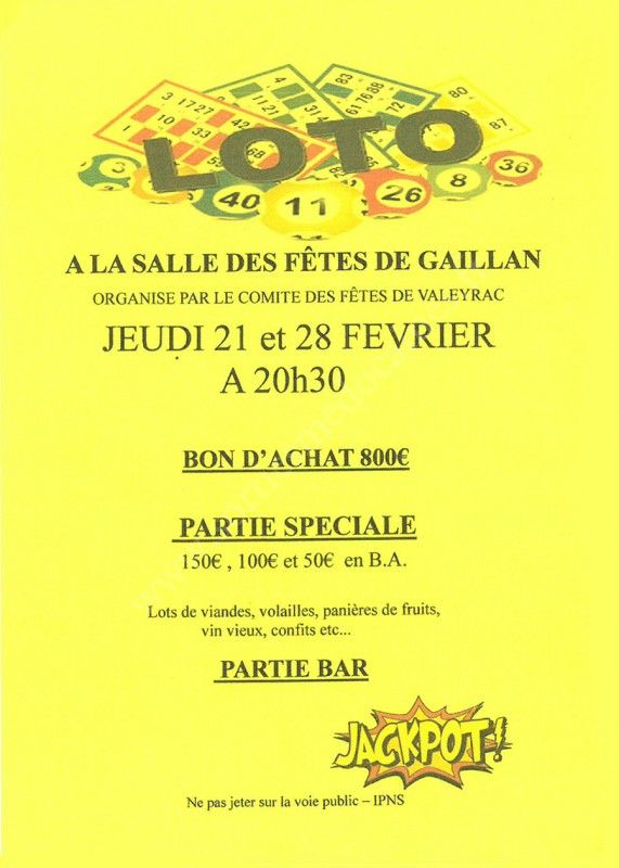 Nombreux lots à gagner dont : lots de viande, vin vieux, panières de fruits, vin vieux, 800€ en B.A., etc...