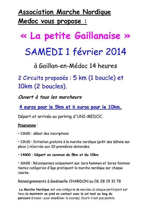 L'association Marche Nordique Médoc de Gaillan organise le samedi 1er février deux marches balisées et chronométrées sur sentier de 5km et 10km.