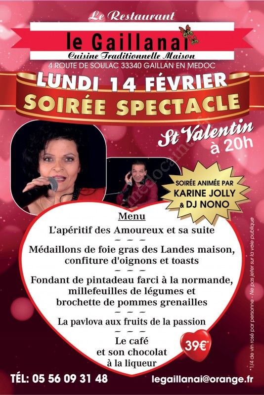Venez passer une soirée romantique à l'occasion de la Saint-Valentin avec, à l'animation, Karine JOLLY et DJ NONO.