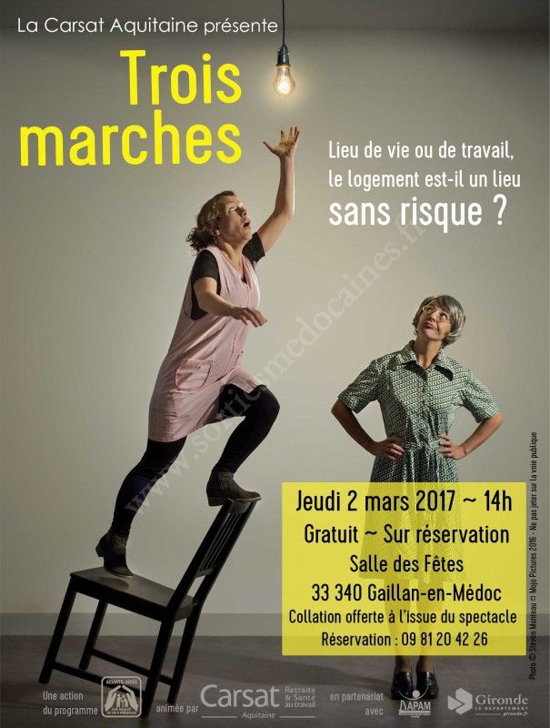 Dans le cadre du programme "Aidants-Aidés, une qualité de vie à préserver", l'AAPAM et la CARSAT organisent une représentation théâtrale destinée à sensibiliser le public aux risques de chutes à domicile, suivie d'un débat sur les situations présentées, et d'un goûter.
