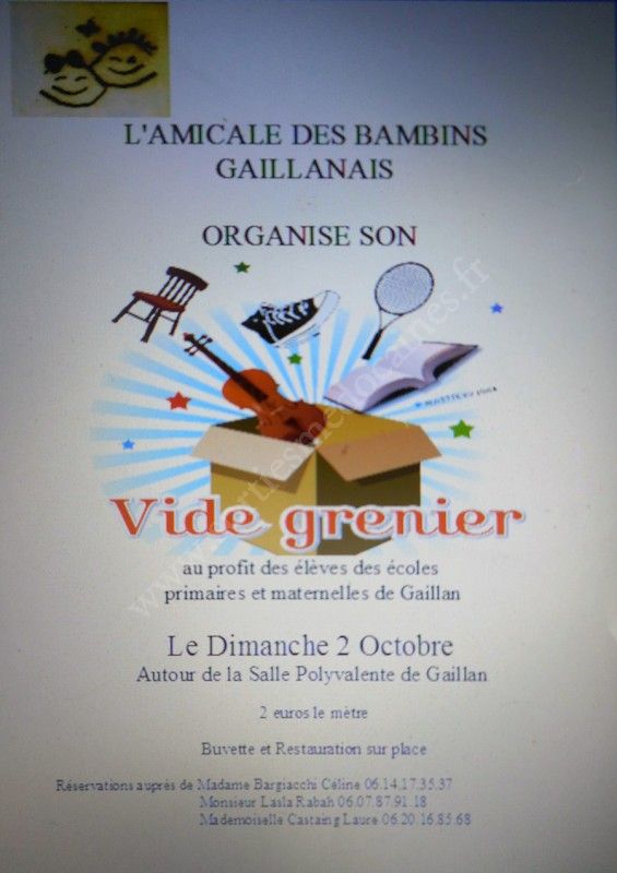 L'Amicale des Bambins Gaillanais organise son vide-grenier au profit des élèves des écoles primaires et maternelles de Gaillan le dimanche 2 octobre 2016.