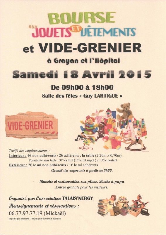 L'association TALAIS’NERGY organise sa 5ème Bourse aux jouets et vêtements, Vide-grenier (Jeux, Livres, BD, vêtements, CD/DVD et Jeux vidéo, etc…).