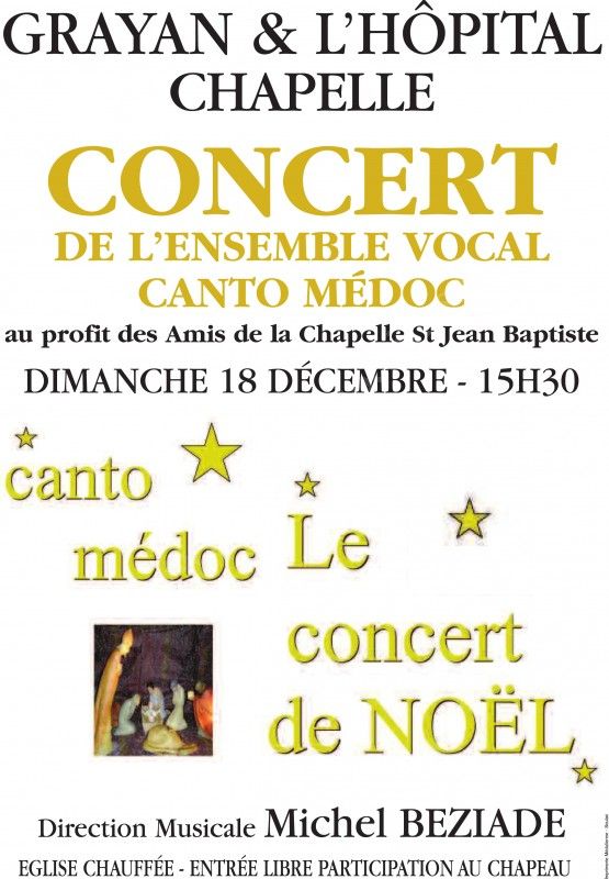 Chants traditionnels de Noël avec la participation de Marie-Lou GAUDRIE soprano, Patick SAUTAREL organiste, Yves DESBOEUF ténor, Richard AFONSO ténor et L'Ensemble Vocal Canto Médoc sous la direction de Michel BEZIADE.