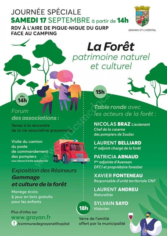 De 15h à 18h : Table ronde, ouverte à toutes et à tous, avec les acteurs de la forêt. Des échanges et discussions avec 6 intervenants autour du thème La Forêt, patrimoine naturel et culturel (exposition des résineuse, gemmage et culture de la forêt).