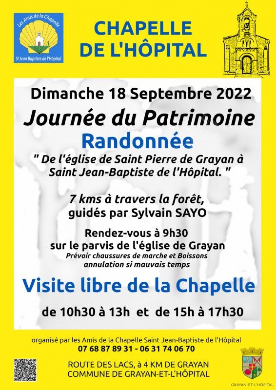 - Et une randonnée de 7 km à travers la forêt : départ à 9h30 du parvis de L'église Saint Pierre de Grayan à la chapelle Saint Jean-Baptiste de l'Hôpital sur les Chemins historiques de Compostelle.