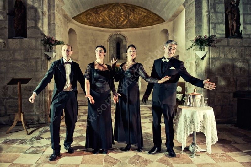 "Spectacle drôle de chansons a cappella ou…. Drôle de spectacle a cappella" Dans ce spectacle a cappella, 4 personnages décalés revisitent, avec enthousiasme et passion, un répertoire varié de standards inscrits dans la mémoire collective. De Beethoven à ABBA, en passant par le slam, le quatuor de la Tour des Anges présente avec modernité et finesse chacune de ses reprises. Soprano, alto, ténor, baryton pour une mixité des voix au service d’une qualité musicale et d’un lyrisme qui n’excluent nullement et surtout pas l’humour.