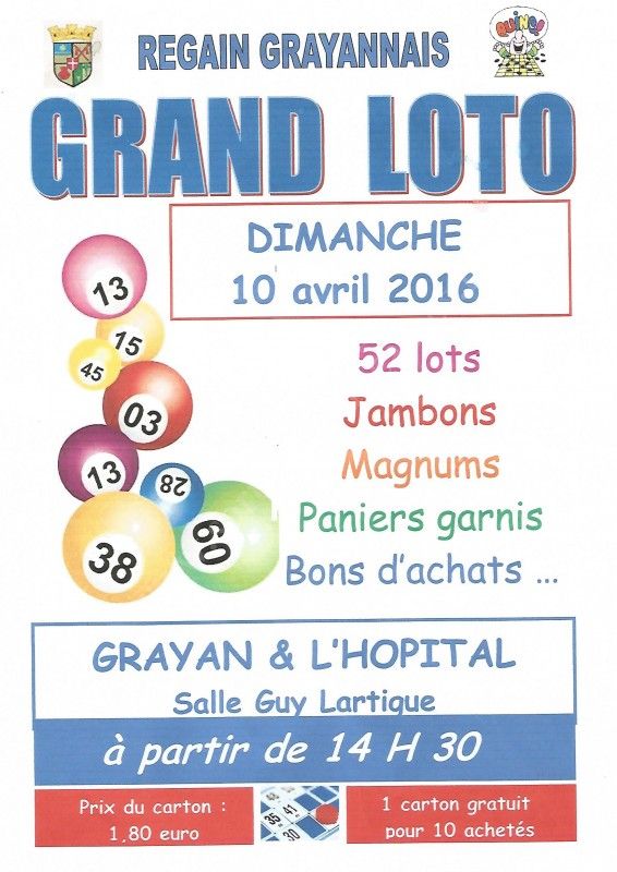 52 lots à gagner dont : jambons, paniers garnis, bon d'achats, huitres saucisses, magrets, etc...........